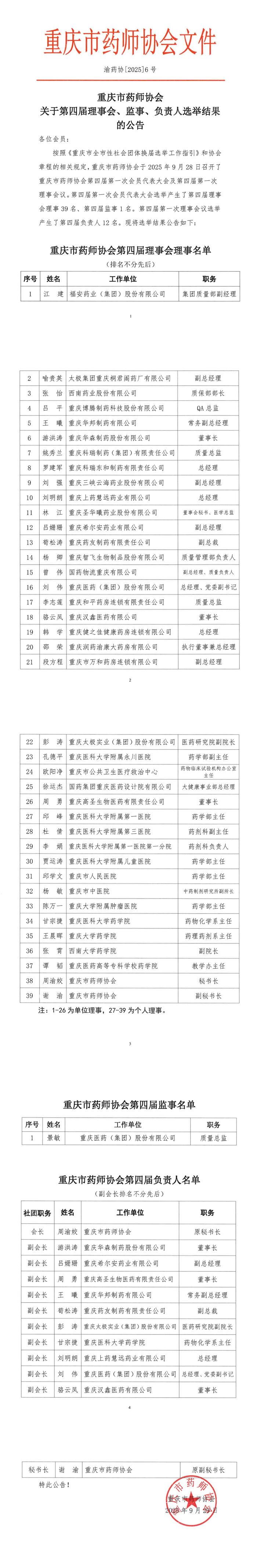 重庆市药师协会关于第四届理事会、监事、负责人选举结果的公告