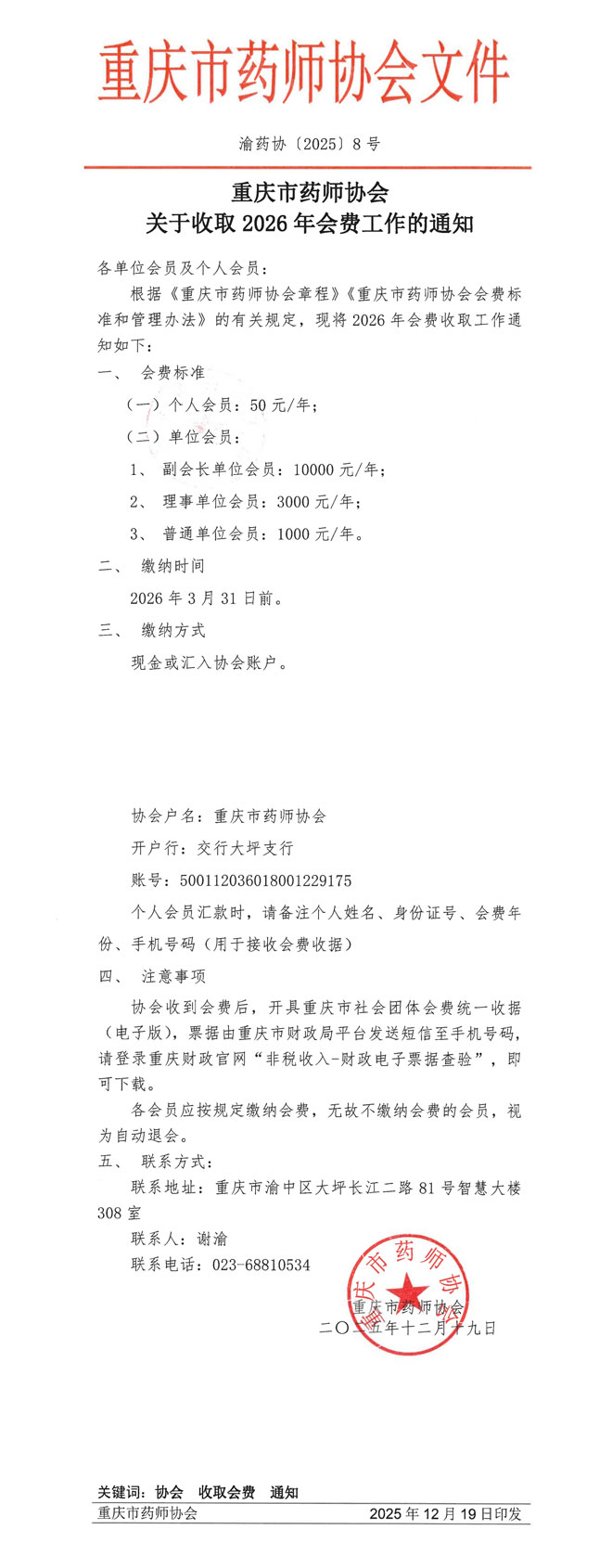 重庆市药师协会关于收取2026年会费的通知